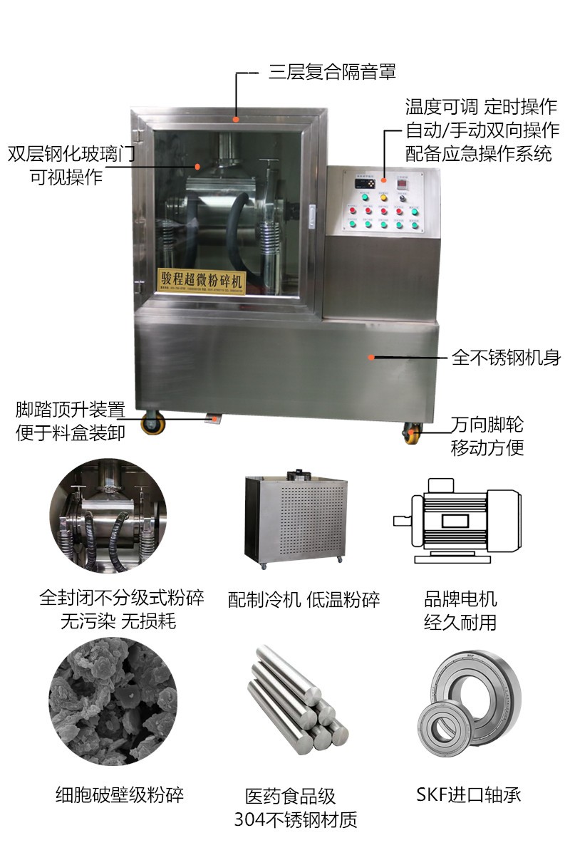 駿程醫(yī)用破壁粉碎機設備型號齊全,既有適合小型生產和科研試驗的小型設備,也有適合工業(yè)化生產的大、中型設備。可以根據客戶需求定制不同型號、不同規(guī)格、不同材質的超微粉碎機,讓客戶的選擇性更靈活。設備性能穩(wěn)定,具有連續(xù)運轉的安全可靠性。使用壽命長、無報廢期。